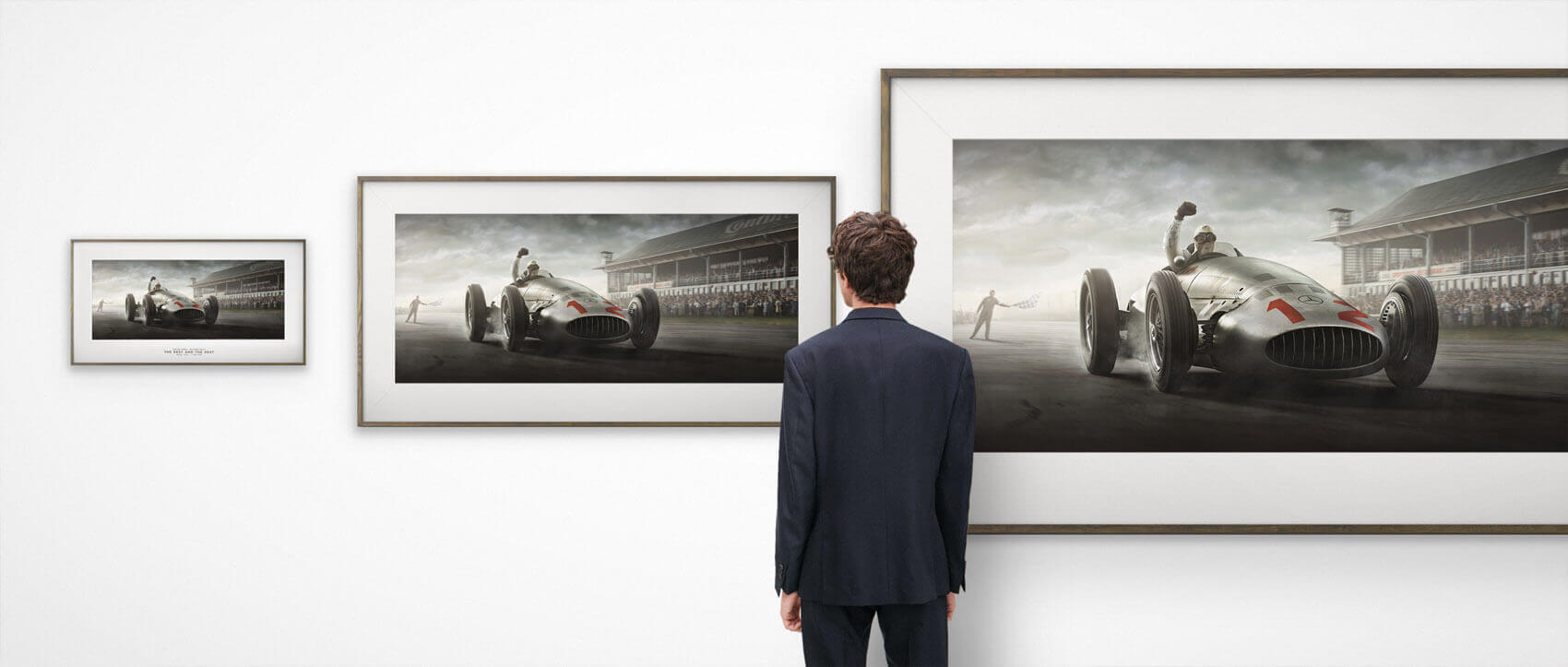 We design each print using a world-unique combination of 3D renderings and CGI technology allowing us to re-create each car to precise coats of paint and scratches with a level of detail never seen before.