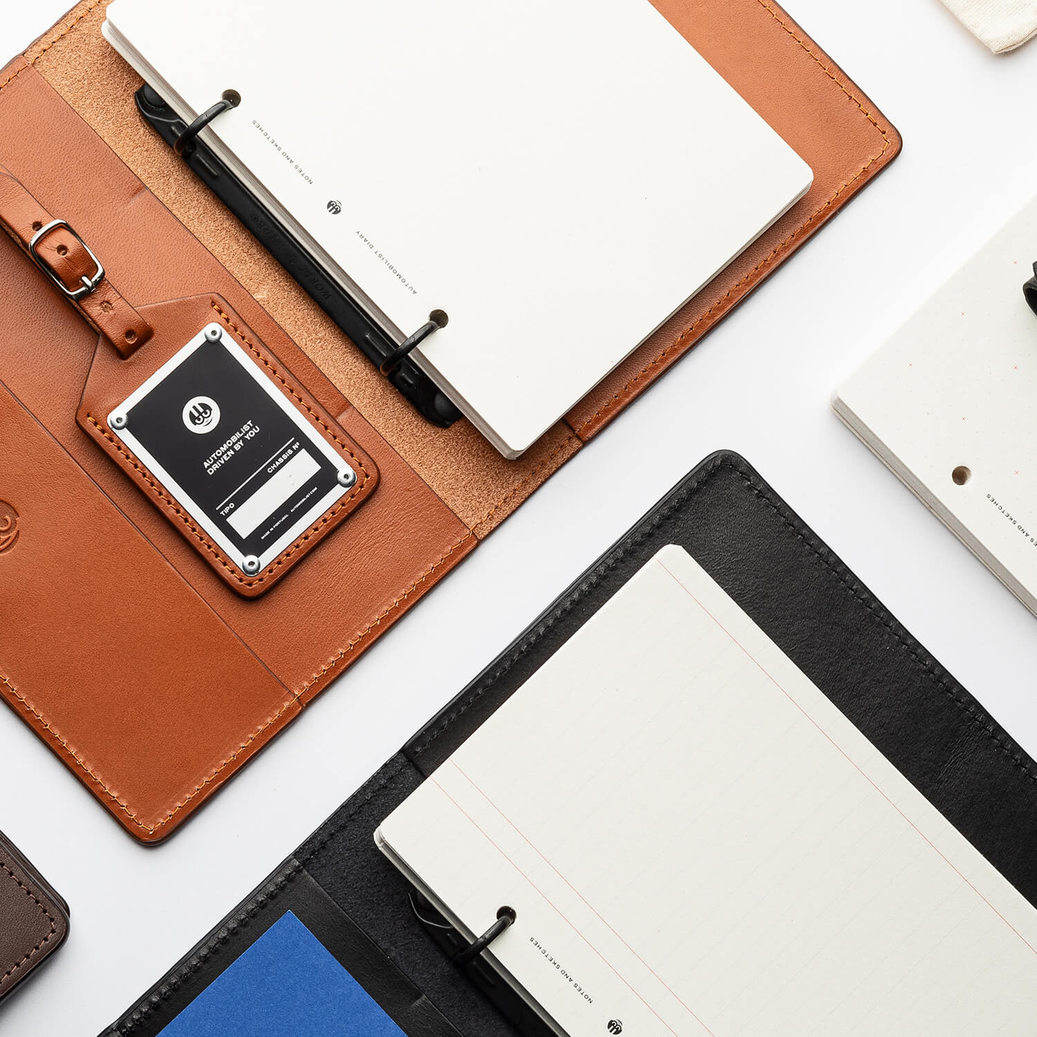 Notebook made from vegetable-tanned leather with metal ring binder and paper inserts. Features an embossed Automobilist logo and a metal plaque that can be customised.