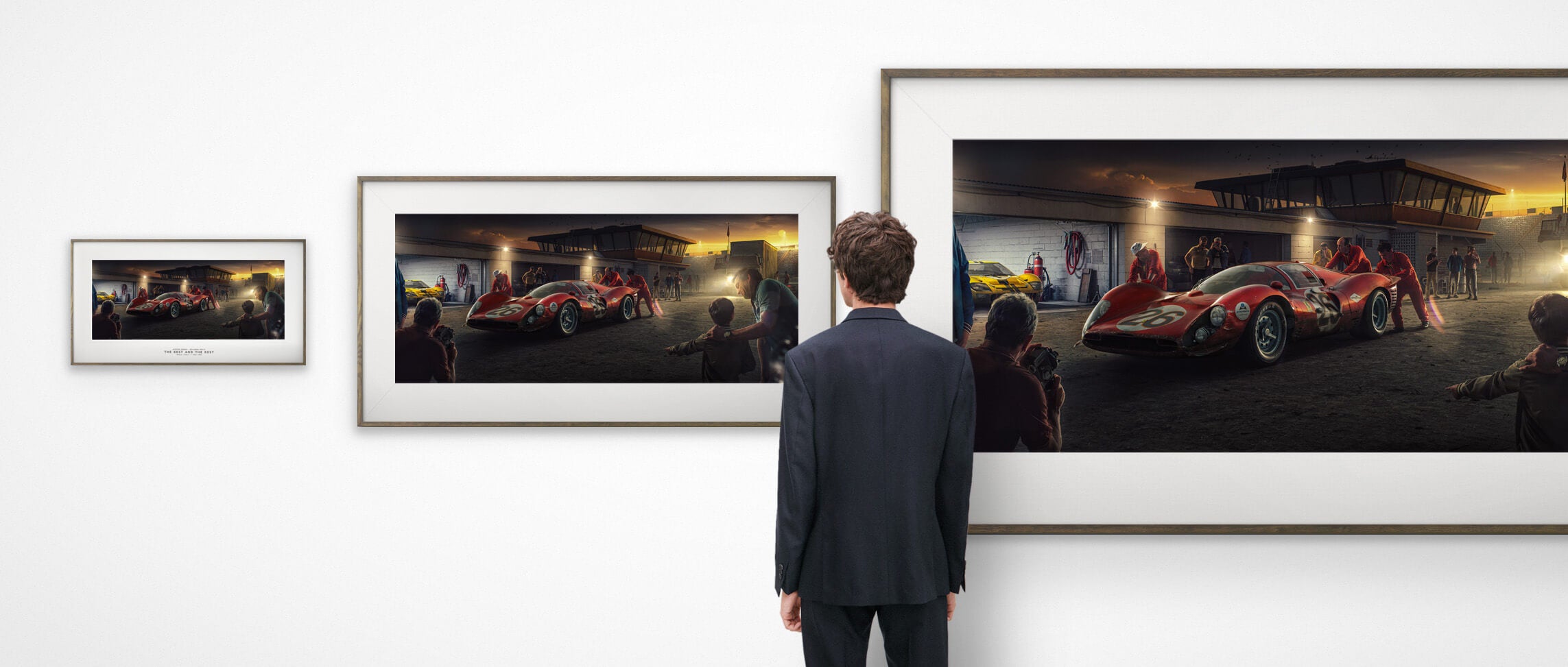 We design each print using a world-unique combination of 3D renderings and CGI technology allowing us to re-create each car to precise coats of paint and scratches with a level of detail never seen before.
