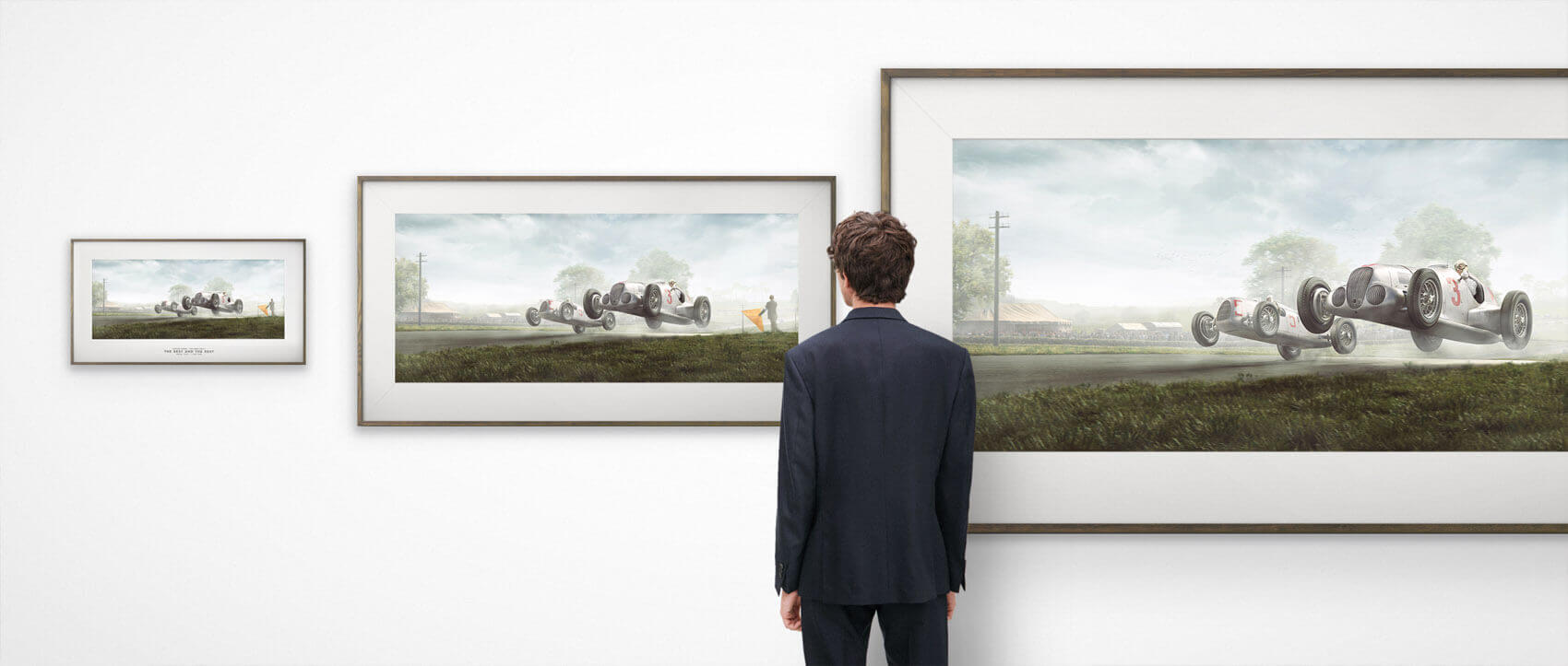 We design each print using a world-unique combination of 3D renderings and CGI technology allowing us to re-create each car to precise coats of paint and scratches with a level of detail never seen before.