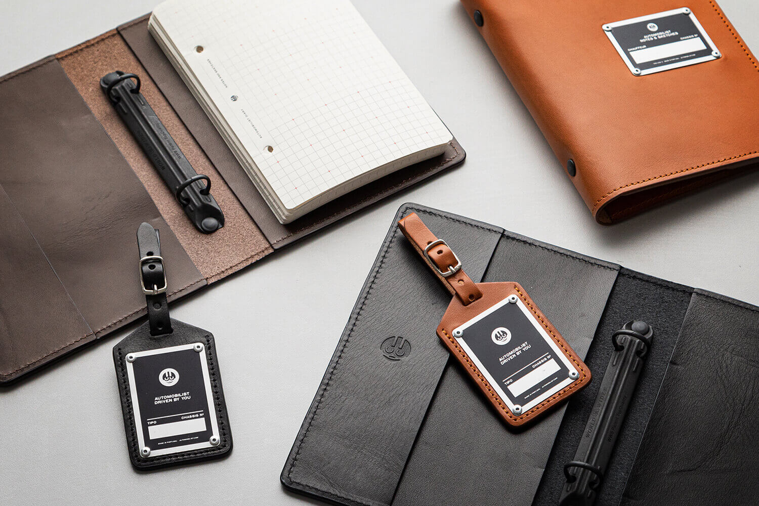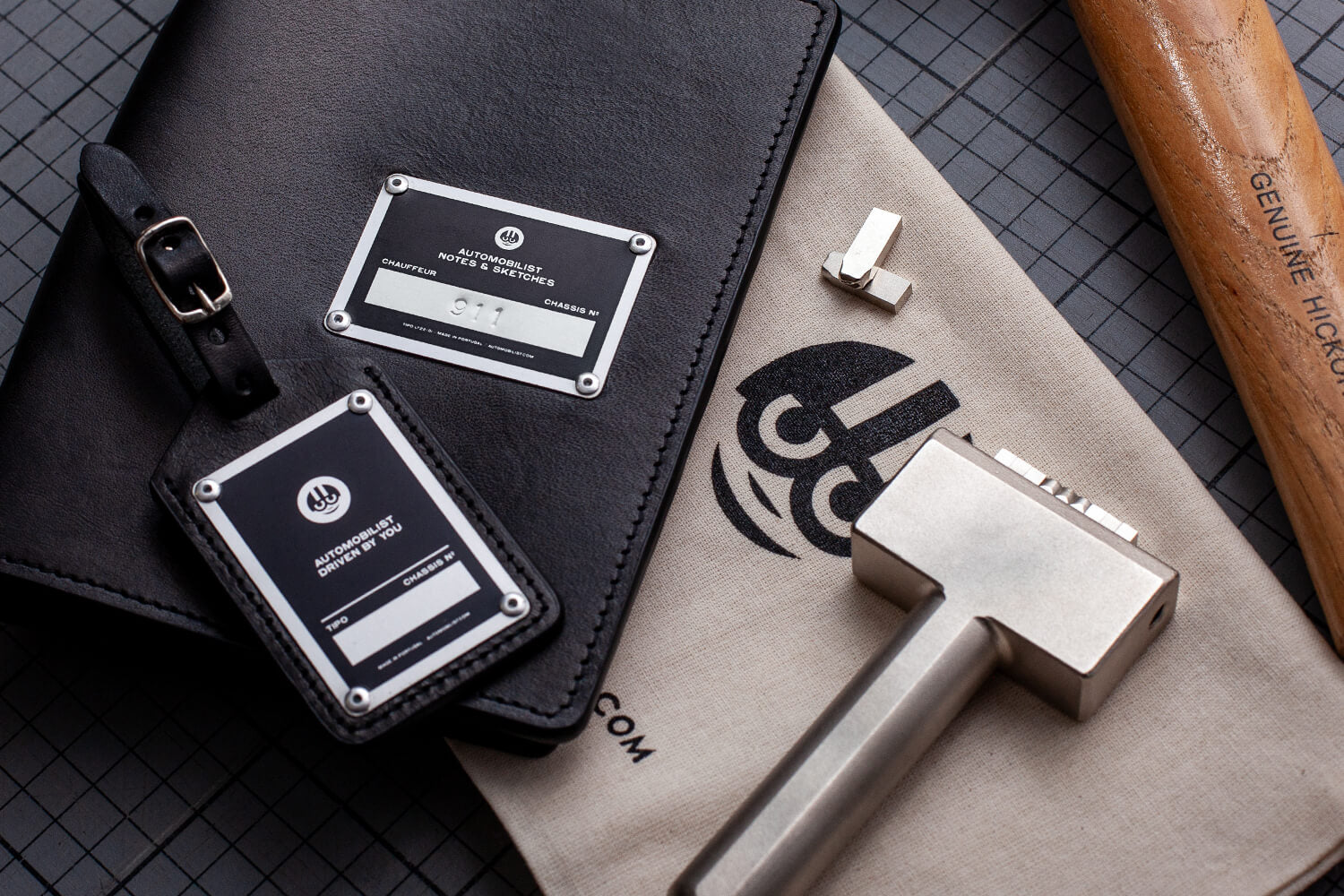 With all of our Automobilist Accessories, there is an option for customisation with a hand-stamped embossing. You can customise your Leather Notebook or Leather Tag with up to 5 letters/numbers, which will be embossed on the metal plate attached to the leather.