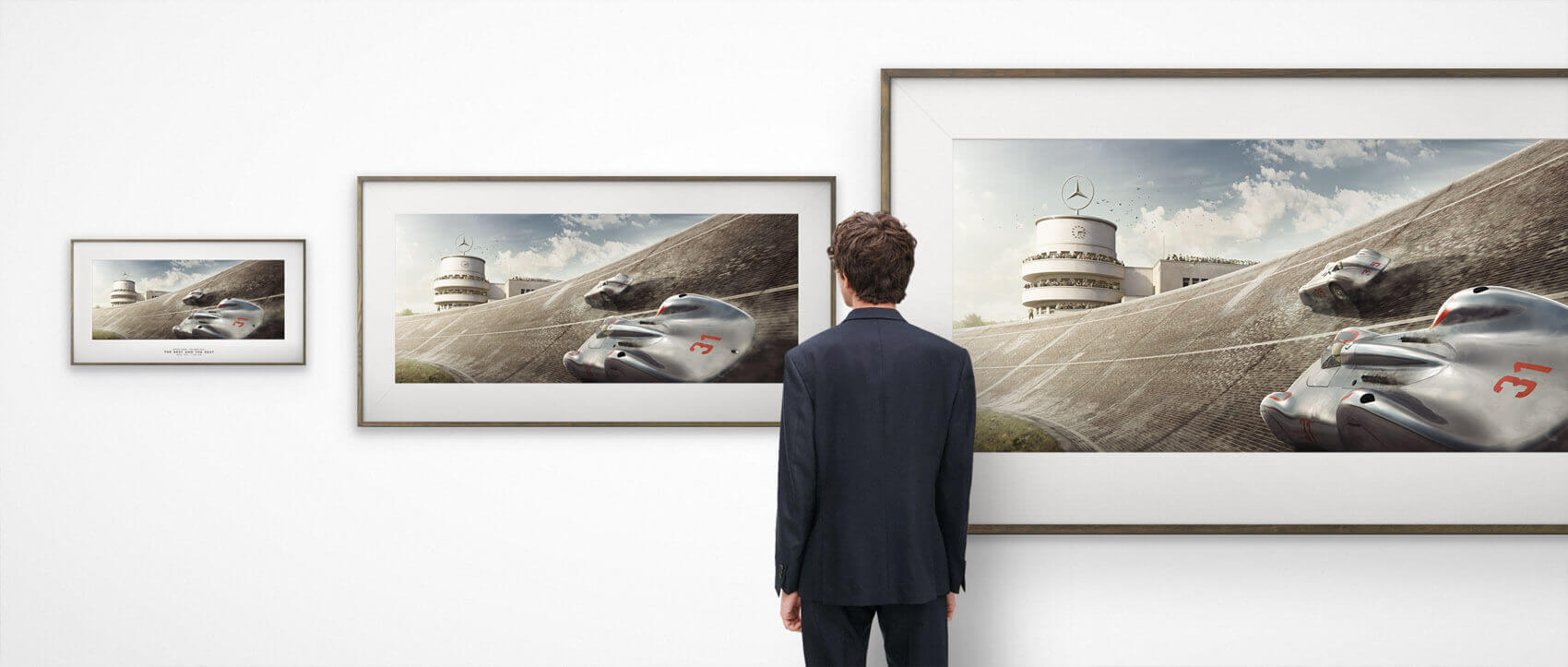 We design each print using a world-unique combination of 3D renderings and CGI technology allowing us to re-create each car to precise coats of paint and scratches with a level of detail never seen before.