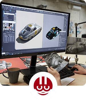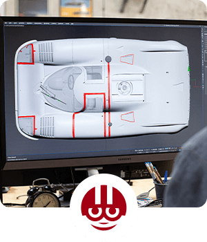 L'étape suivante de la conception de l'impression consiste à texturer le modèle 3D nu de la voiture, qui n'est au départ qu'un squelette gris. Au cours de ce processus, la voiture reçoit sa célèbre couleur, et même les plus petits détails sont ajoutés pour rendre le design final aussi fidèle que possible à l'original.